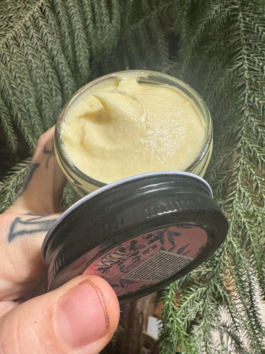 Elderberry and Evergreen Whipped Tallow (glass jars- now with new labels and title “elderflower & pine whipped tallow”)