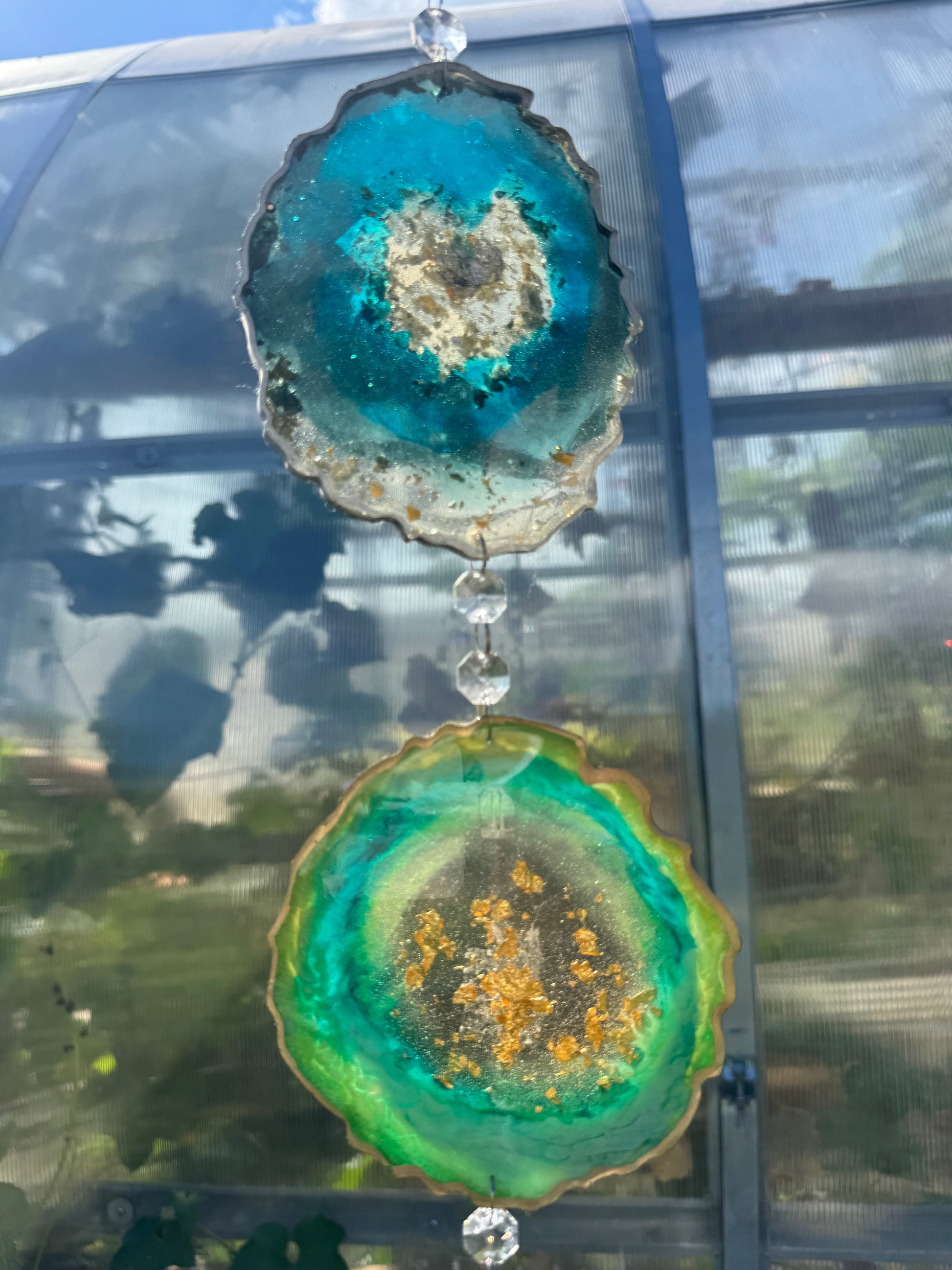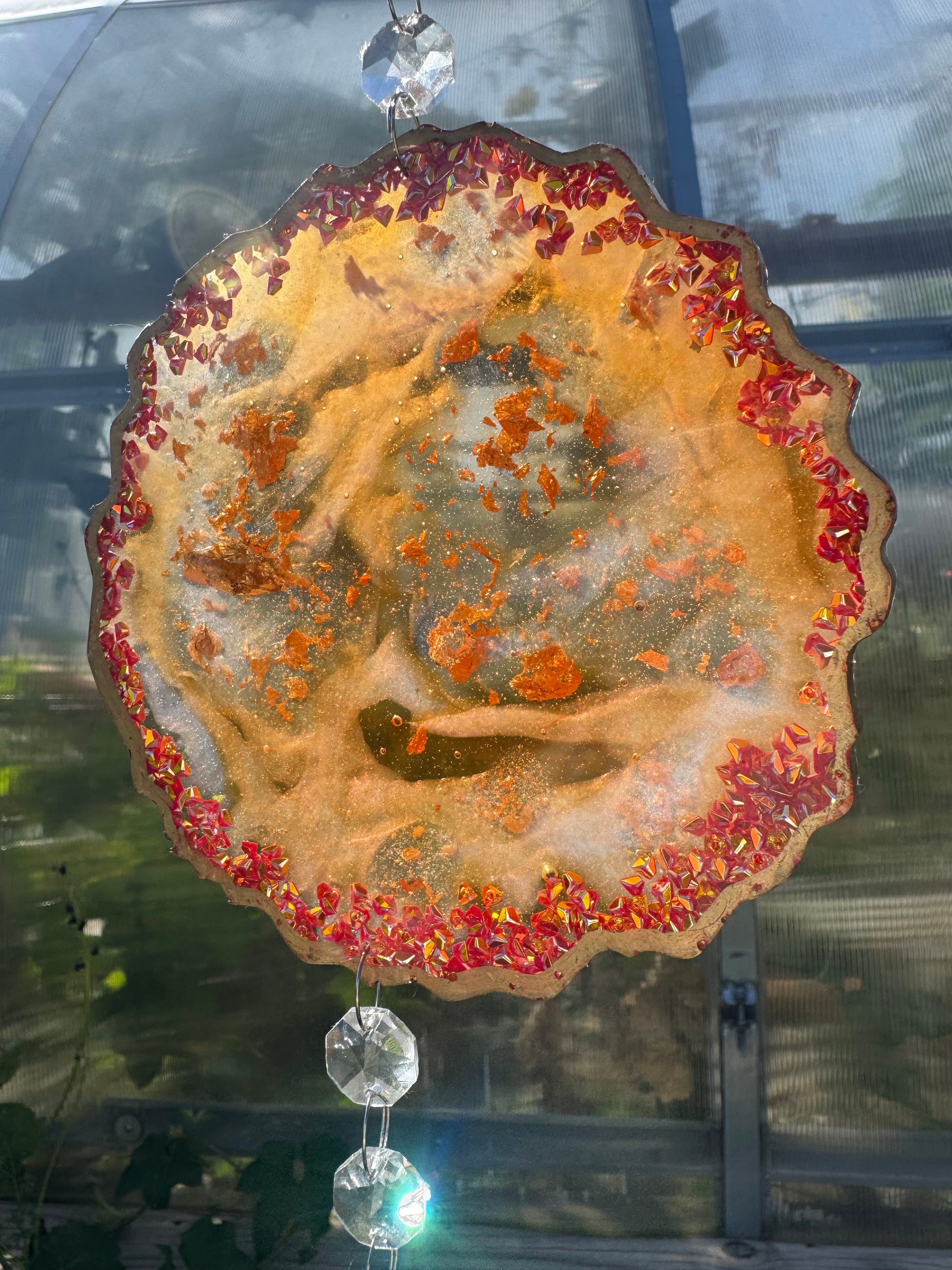 Each sun catcher is hand-cast on our farm using marine-grade, never-yellowing resin. Every piece is hand-poured by me, inspired by nature, and often incorporates items directly from our land. Finished with crystals and prisms, each sun catcher is designed to scatter rainbows across your walls and windows.