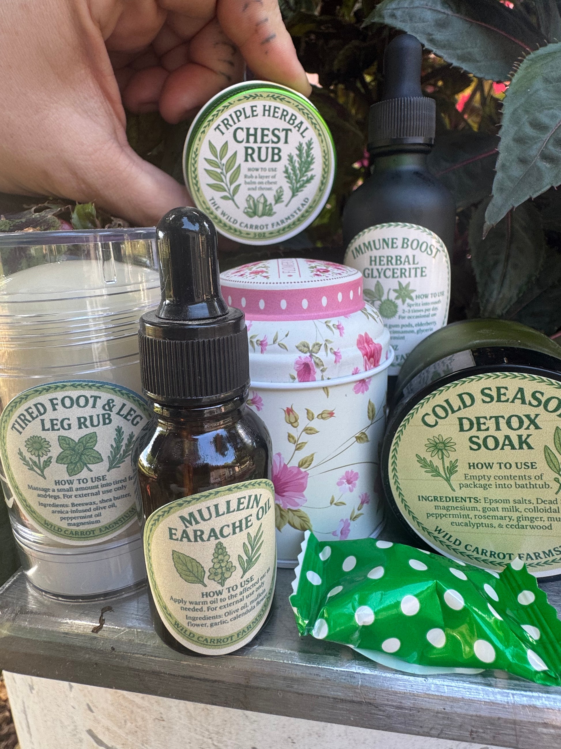 The Cozy Breather Bundle is a curated set of six herbal remedies designed to bring relief, comfort, and clarity during times of congestion, earaches, seasonal illness, and overall fatigue. Each product is made with herbs grown or gathered on our farm, blended with care into time-tested recipes that your family can rely on.